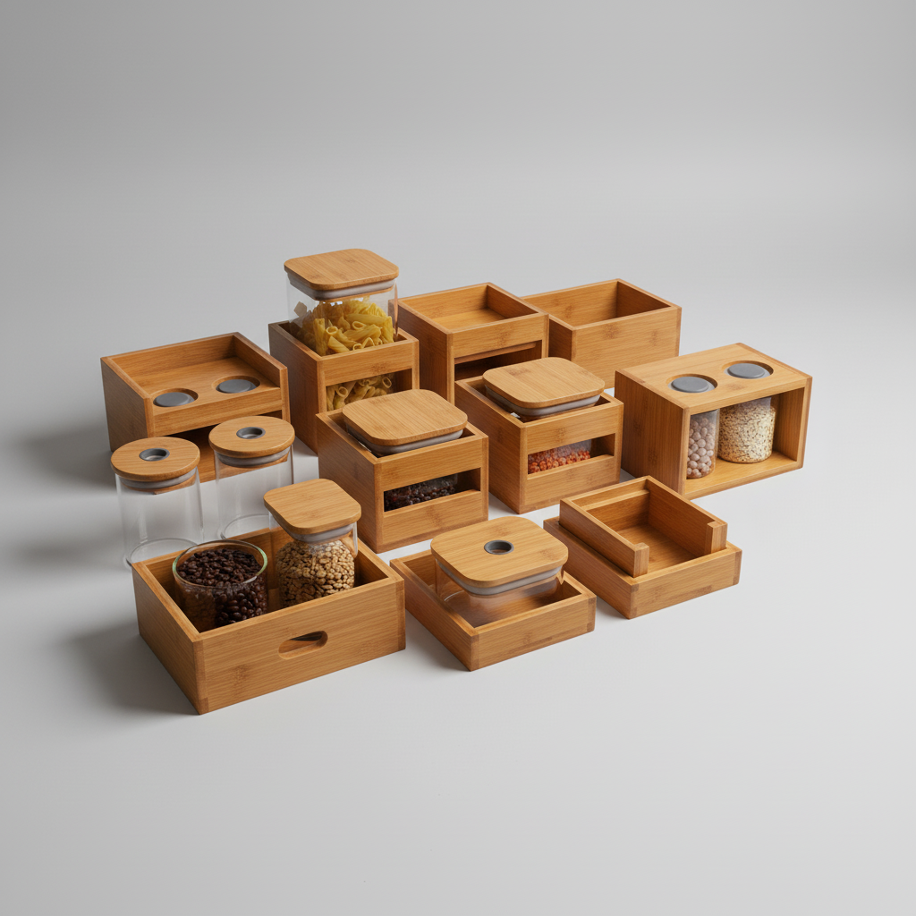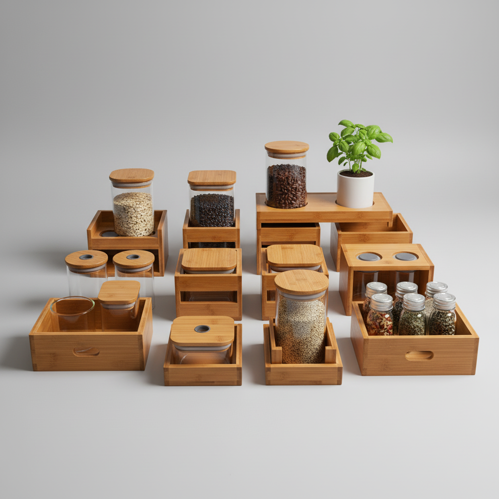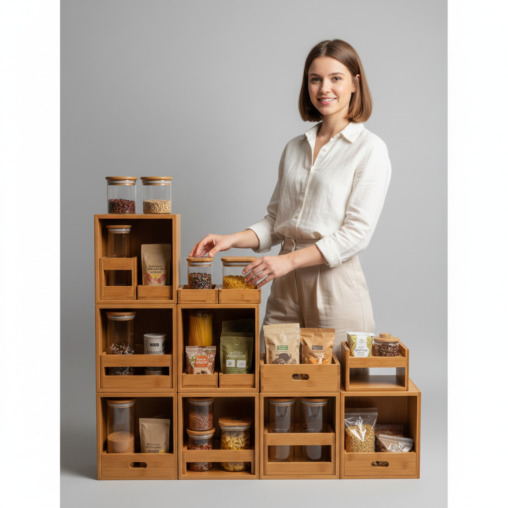 Das modulare Regal System schafft Ordnung und Ästhetik in Ihrer Speisekammer oder Küche. Gefertigt aus nachhaltigem Bambus und ergänzt durch hochwertige Glasbehälter, bietet es eine elegante und praktische Lösung für die Lagerung Ihrer Lebensmittel. Das Design folgt klaren Linien und fördert eine übersichtliche Präsentation, die den Alltag erleichtert.