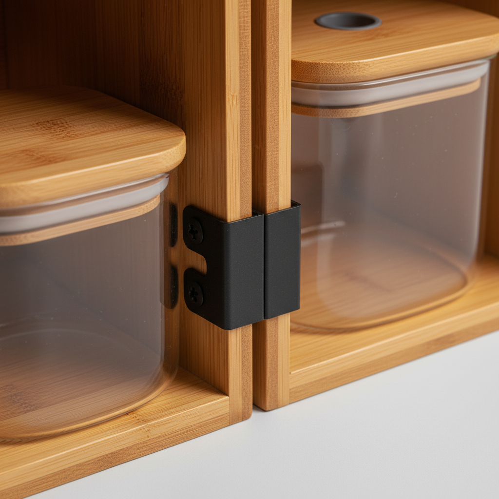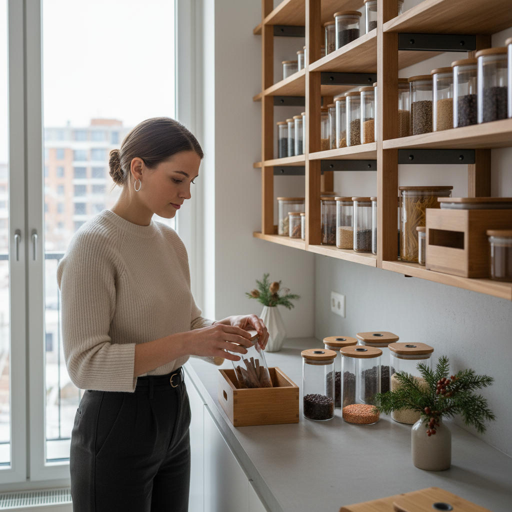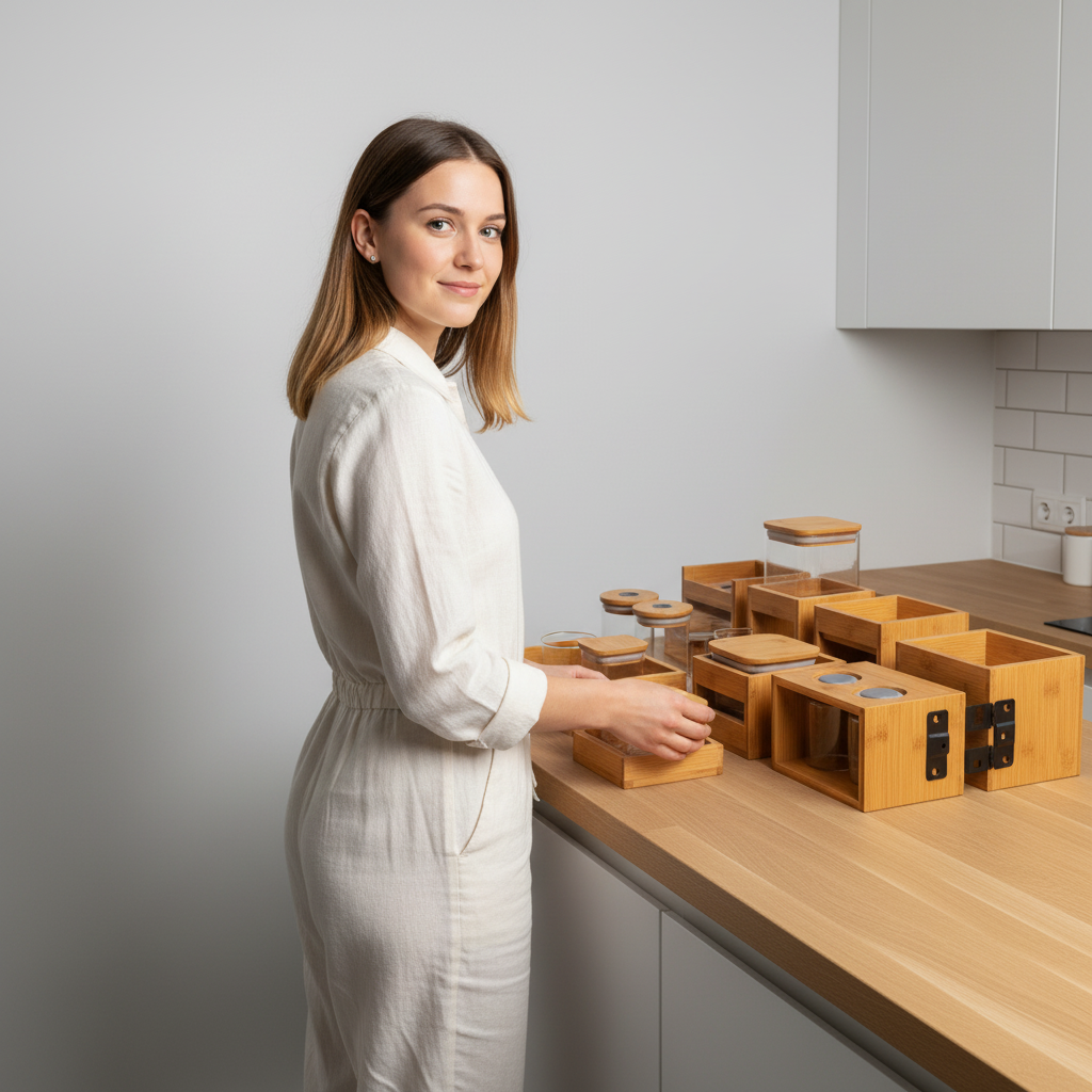 Das modulare Regal System schafft Ordnung und Ästhetik in Ihrer Speisekammer oder Küche. Gefertigt aus nachhaltigem Bambus und ergänzt durch hochwertige Glasbehälter, bietet es eine elegante und praktische Lösung für die Lagerung Ihrer Lebensmittel. Das Design folgt klaren Linien und fördert eine übersichtliche Präsentation, die den Alltag erleichtert.