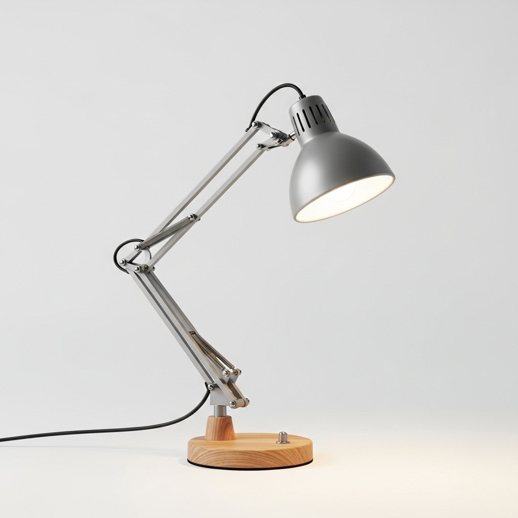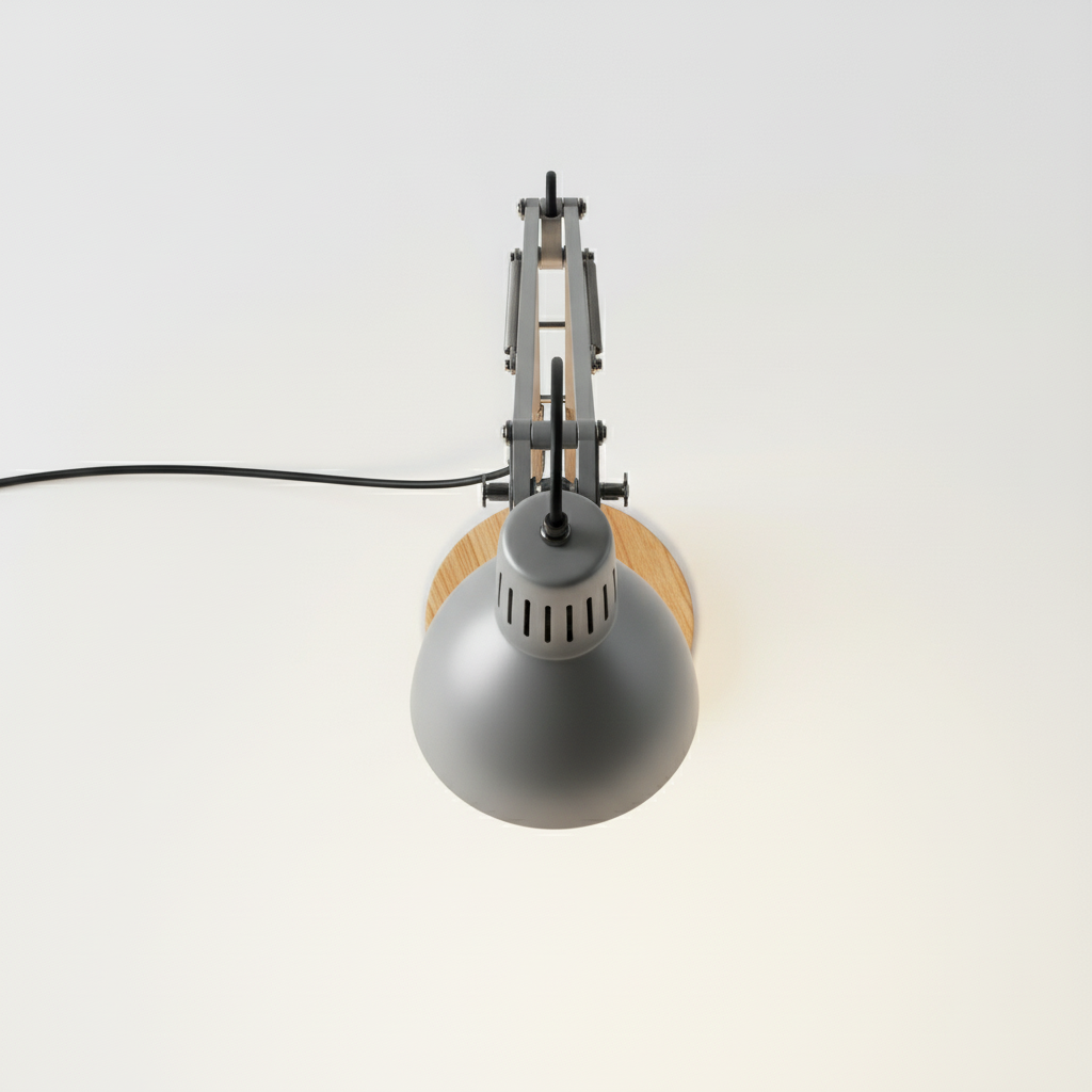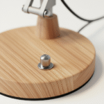 Gefertigt aus einem soliden Echtholz-Standfuß und -Arm, kombiniert mit einem Lampenschirm und Gelenken aus hochwertigem, mattschwarz pulverbeschichtetem Metall für maximale Stabilität und eine edle Haptik.